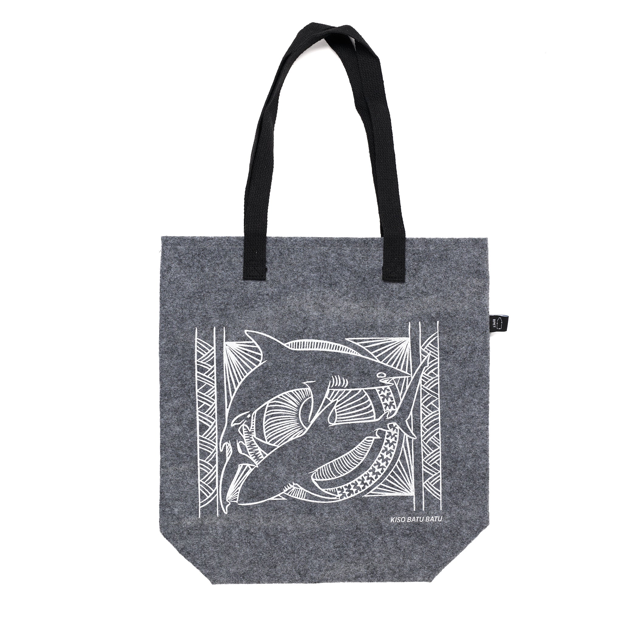 This eco-friendly tote bag made from recycled PET water bottles showcases the beautiful artwork from Aldio Pita's original woodblock print, KISO BATU BATU.