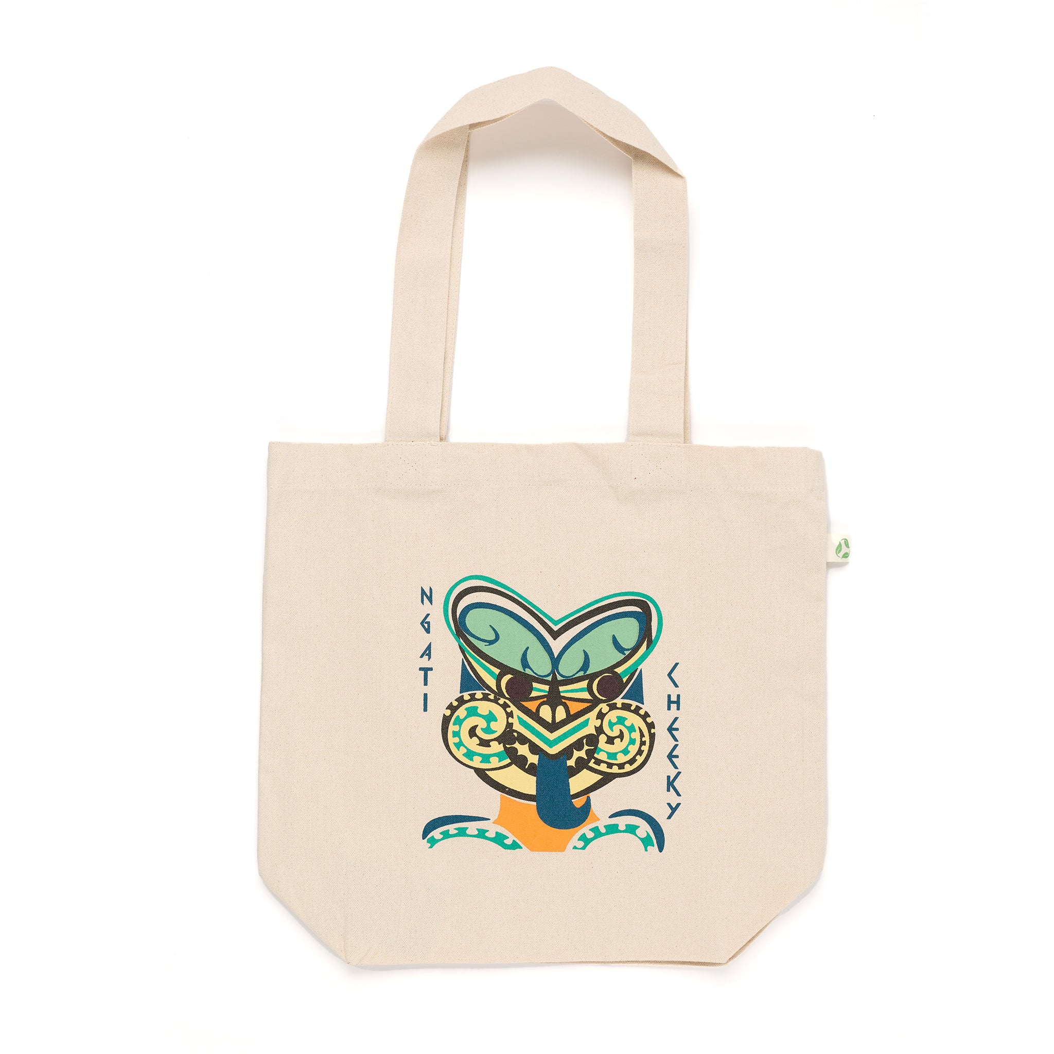 This quality 10oz organic cotton canvas tote bag features printed Ngāti Cheeky Skux by Jamie Berry - Te Aitanga-a-Mahaki, Rongowhakaata, Ngāti Porou, Ngāpuhi, Ngāti Ruanui.