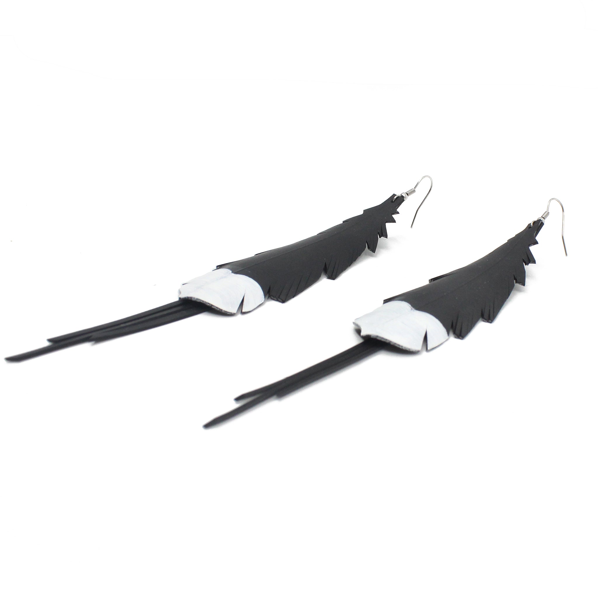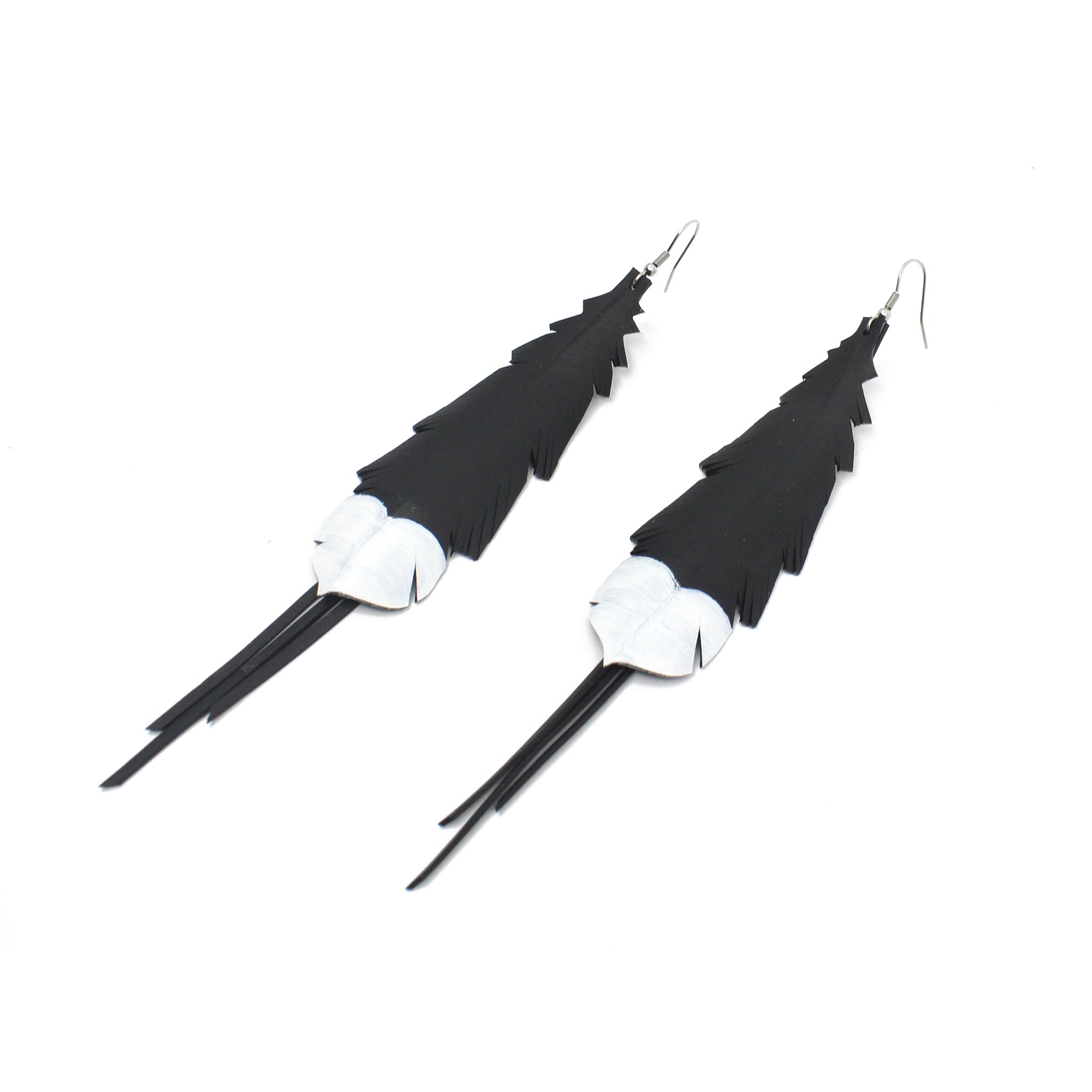 These elegant up-cycled Huia Feather earrings with Strands have been hand painted and hand crafted from bicycle tyre inner tubes by Ronja Schipper.