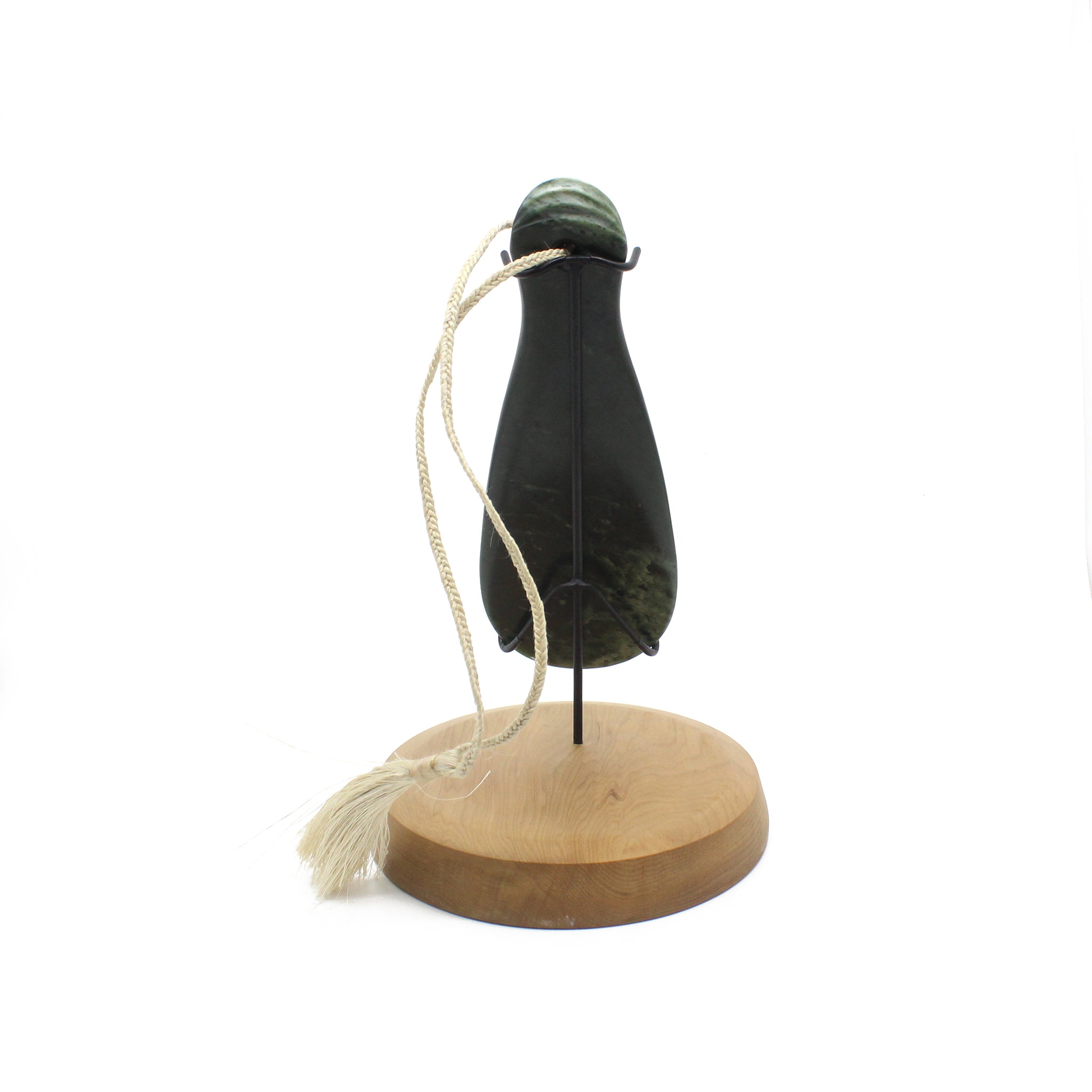 This beautiful Mere Pounamu has been hand carved from New Zealand pounamu (greenstone/jade) by carver Karaitiana Akroyd - Ngāti Porou, Rongowhakaata, Te-Aitanga-a-Māhaki, Tūhoe. The Mere sits on a Tōtara stand.