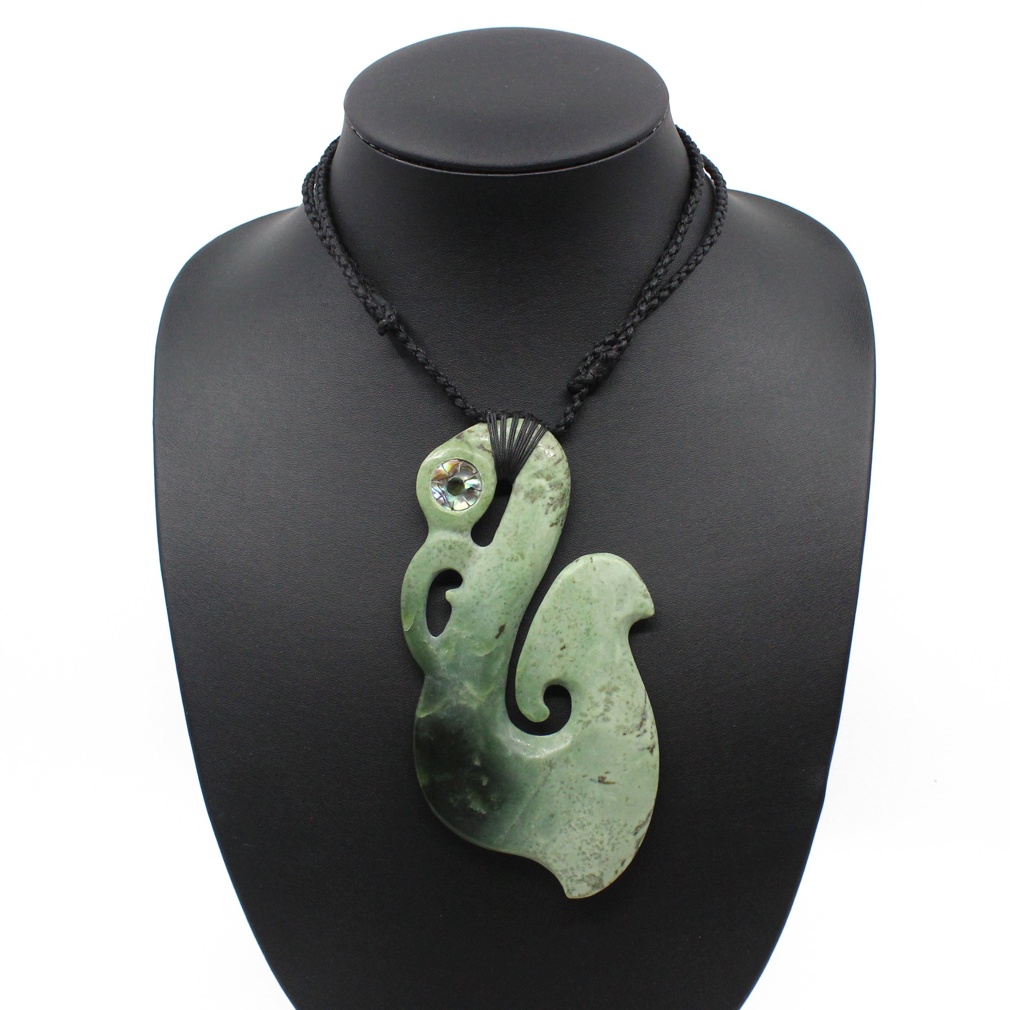 This beautiful Manaia pendant has been carved from New Zealand pounamu (greenstone/ jade) by Sands Carving Studio founded by carver Alex Sands- Ngāti Kahungunu o Te Wairoa, English, Scottish and Irish. It features a beautiful pāua shell eye.