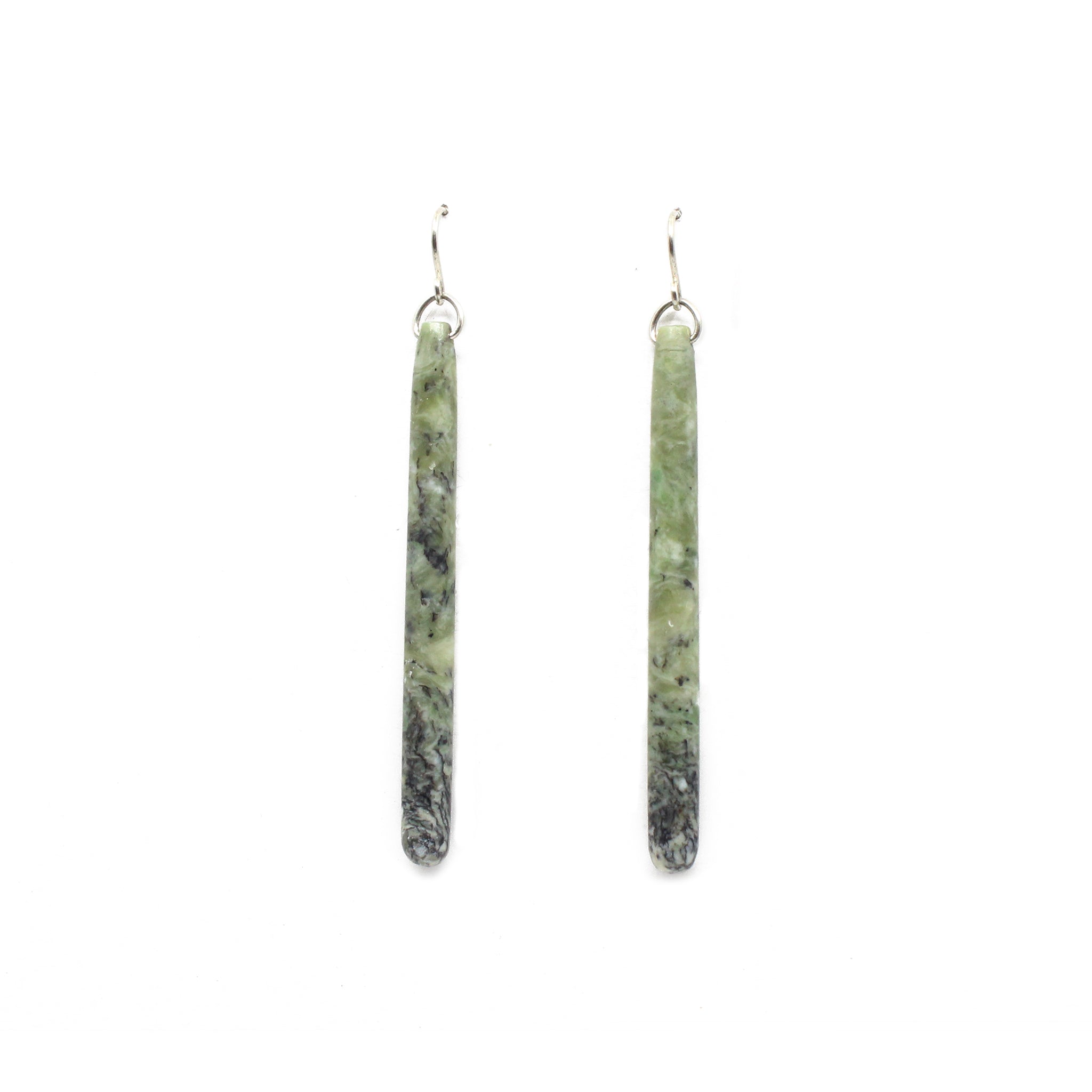 These beautiful drop earrings have been handcrafted by Elisha Hobbs using Te Tau Ihu Pounamu found in Nelson, New Zealand and set with sterling silver hooks.