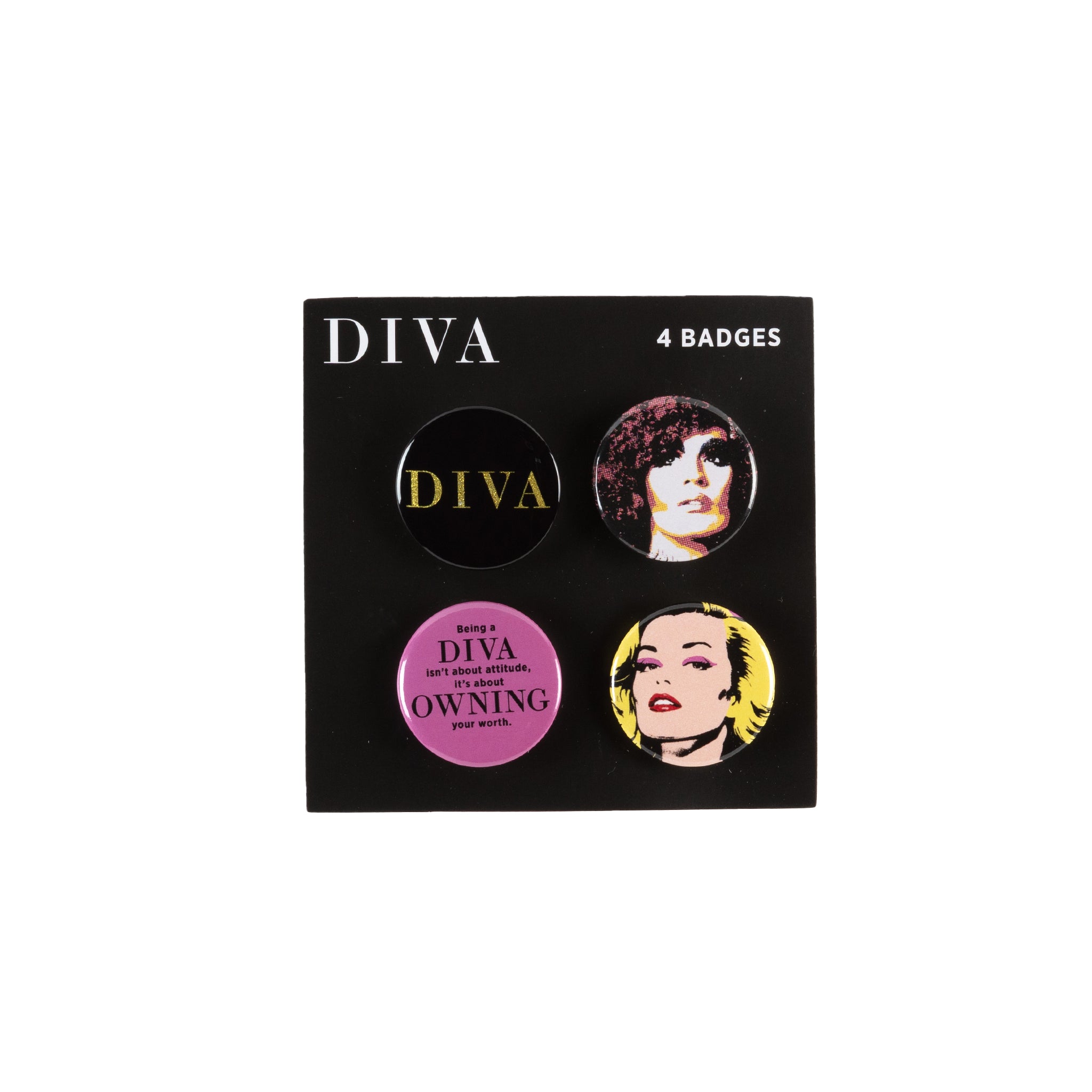 This set includes four beautiful badges, each showcasing a unique design inspired by our current exhibition: DIVA.