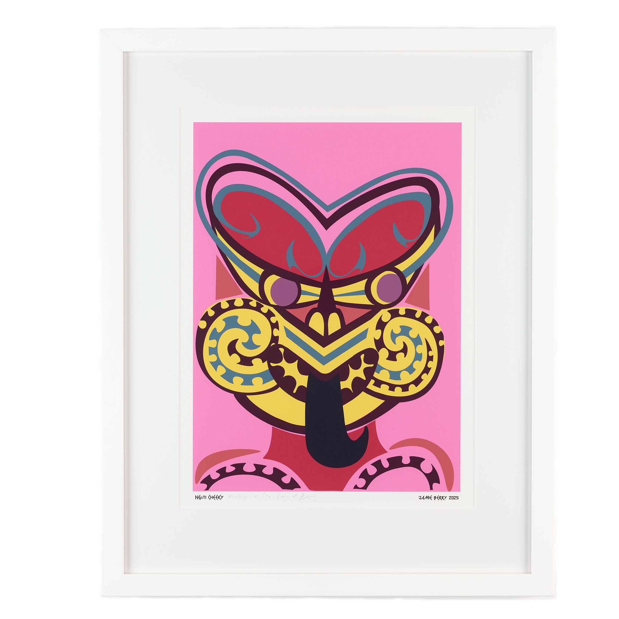 A beautiful "Ngāti Cheeky Pinky" framed print by Jamie Berry - Te Aitanga-a-Mahaki, Rongowhakaata, Ngāti Porou, Ngāpuhi, Ngāti Ruanui.