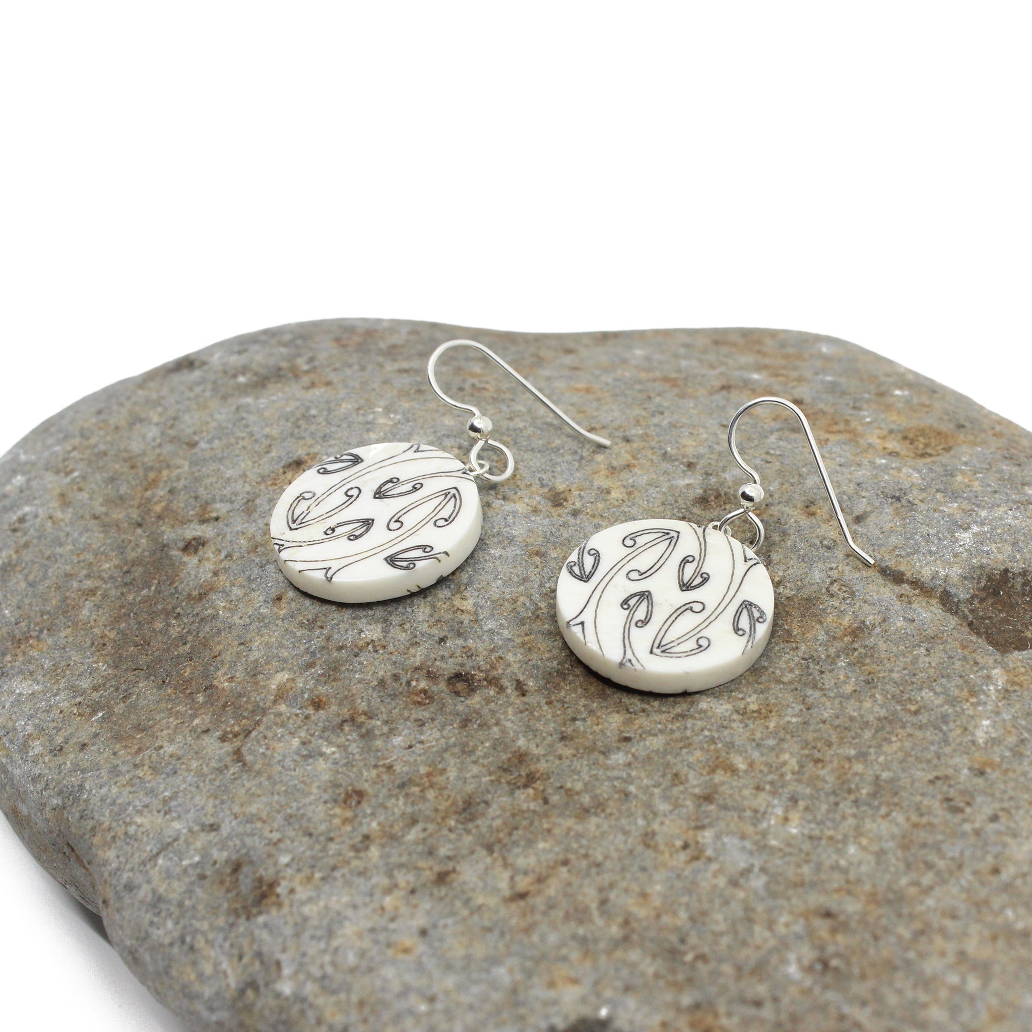 These beautiful earrings showcasing the Mangōpare design has been crafted from beef bone by Amanda Thompson.