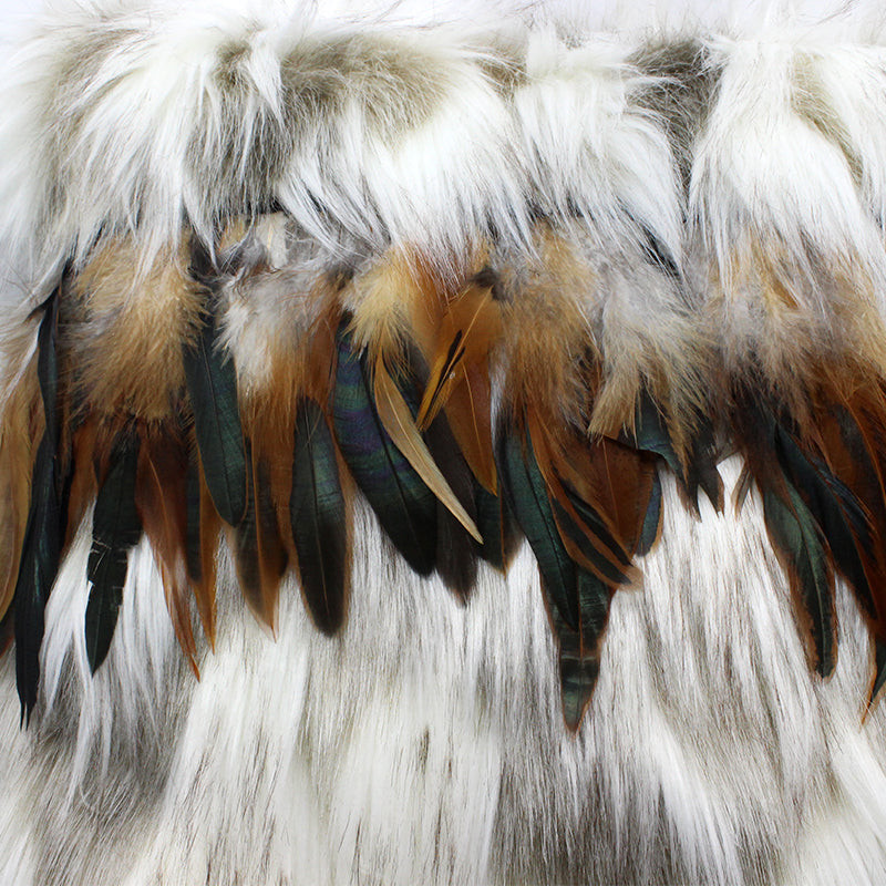 This beautiful cushion cover has been handcrafted using faux fur fabric and it features a long brown rooster feather trim.