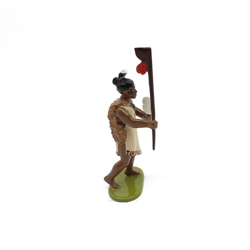 This authentic figurine of a Māori warrior holding a Tewhatewha and a Wahaika is made from white metal and then meticulously hand painted by Regal Enterprises.